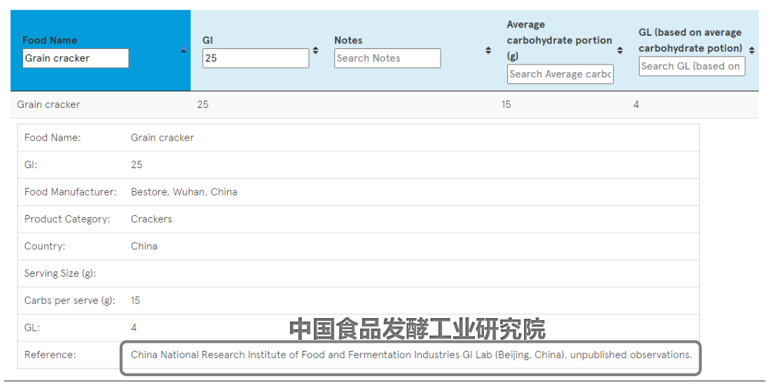 國際GI數(shù)據(jù)庫產(chǎn)品搜索結(jié)果頁(一款國內(nèi)已測低GI的產(chǎn)品)