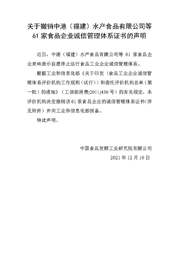 關于撤銷中港(福建)水產食品有限公司等61家食品企業誠信管理體系證書的聲明