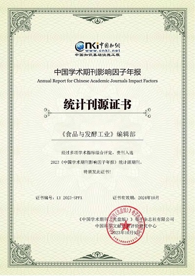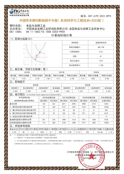 《食品與發(fā)酵工業(yè)》由中國(guó)食品發(fā)酵工業(yè)研究院主辦,創(chuàng)刊于1970年。多次榮獲“中國(guó)百種杰出學(xué)術(shù)期刊獎(jiǎng)”“中國(guó)精品科技期刊”等稱號(hào);連續(xù)兩年被評(píng)為《科技期刊世界影響力指數(shù)WJCI》食品科學(xué)技術(shù)類Q1區(qū)學(xué)術(shù)期刊,并成功入選《食品科學(xué)與工程領(lǐng)域高質(zhì)量科技期刊分級(jí)目錄》T1類,是中國(guó)科學(xué)引文數(shù)據(jù)庫(kù)(CSCD)核心期刊、中文核心期刊、中國(guó)科技核心期刊。
