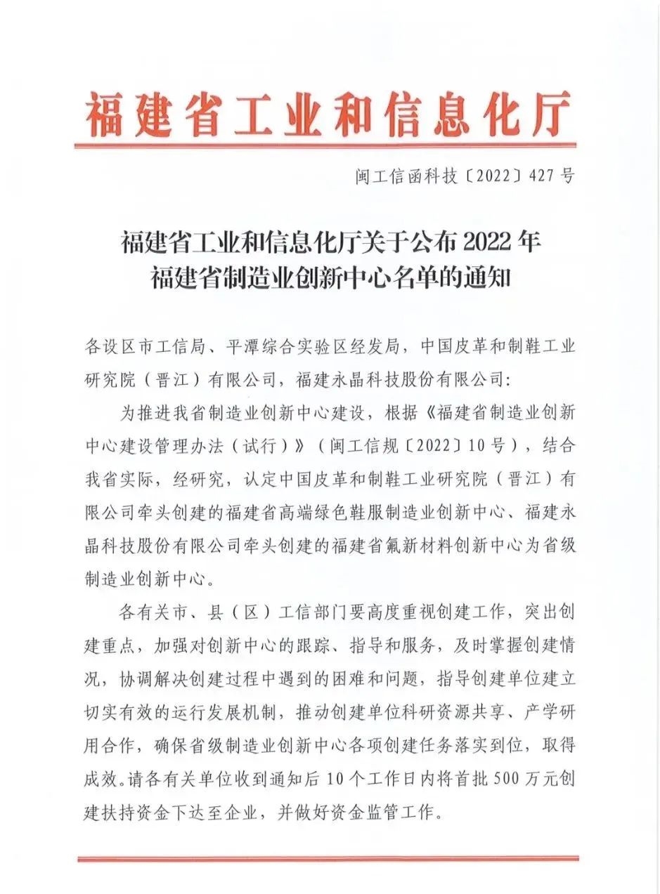 8月26日,福建省工業和信息化廳印發《福建省工業和信息化廳關于公布2022年福建省制造業創新中心名單的通知》,保利中輕所屬中國皮革制鞋研究院晉江公司榜上有名,牽頭創建運營的福建省高端綠色鞋服制造業創新中心(簡稱鞋服創新中心)被認定為福建省級制造業創新中心。