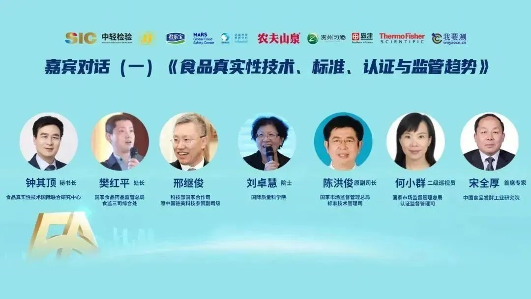 在嘉賓對話環(huán)節(jié),國家質(zhì)量監(jiān)督檢驗檢疫總局原總工程師、中國防偽行業(yè)協(xié)會理事長劉卓慧,國家市場監(jiān)督管理總局標準技術(shù)管理司原副司長(正司級)陳洪俊,國家市場監(jiān)管總局特殊食品安全監(jiān)管司副司長樊紅平,科技部國際合作司、原中國駐美科技參贊邢繼俊,國家市場監(jiān)督管理總局認證監(jiān)督管理司二級巡視員何小群、中國食品發(fā)酵研究院首席專家宋全厚教授圍繞“食品真實性技術(shù)、標準、認證與監(jiān)管趨勢”主題,分別從國家質(zhì)量基礎(chǔ)設(shè)施建設(shè)、食品質(zhì)量標準體系建設(shè)、高品質(zhì)認證、保健食品監(jiān)管趨勢、國際科技合作、食品真實性檢測和認證等方面進行討論,并達成共建食品真實性產(chǎn)業(yè)生態(tài)科學(xué)共識。