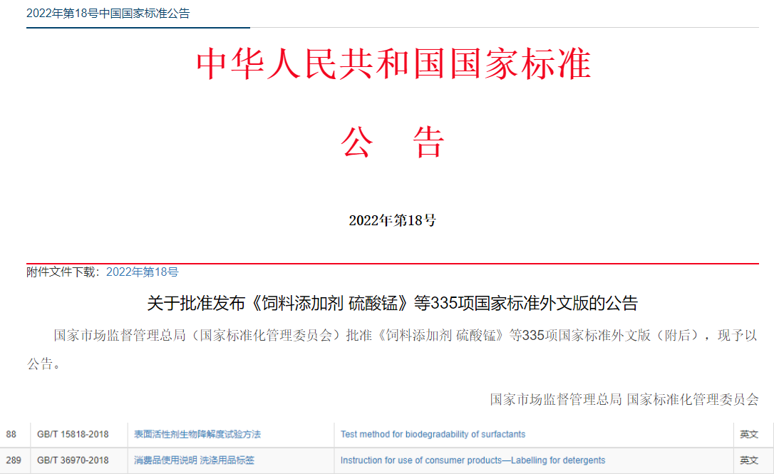 中國日用化學研究院制修訂的《手洗餐具用洗滌劑》《衛生潔具清洗劑》等11項國家標準及《表面活性劑生物降解度試驗方法》《消費品使用說明 洗滌用品標簽》2項國家標準外文版獲批發布。