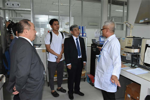 曹春昱一行首先來到柬埔寨國家科學技術創新實驗室(STINL),參觀水化學檢測室、重金屬元素分析室、果汁及啤酒中試車間等實驗室場所,詳細了解“一帶一路”聯合實驗室運行情況及此前中方援助設備使用情況。