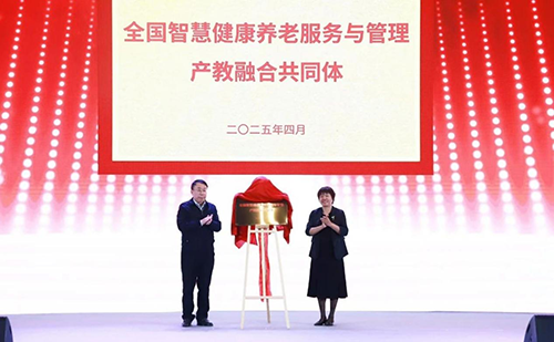 北京市教委二級巡視員楊江林、北京市民政局二級巡視員白玲為“全國智慧健康養老服務與管理產教融合共同體”揭牌。
