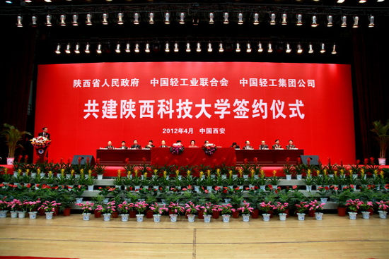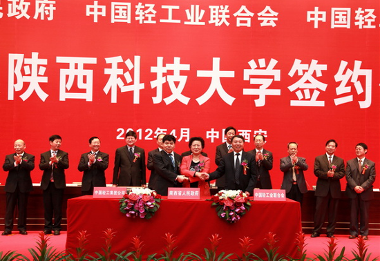 2012417日,陜西省人民政府與中國輕工業聯合會、中國輕工集團公司共建陜西科技大學簽約儀式在陜西科技大學隆重舉行。集團公司董事長、黨委書記陳鄂生出席簽約儀式,并代表集團公司與陜西省朱靜芝副省長、中國輕工業聯合會步正發會長簽署共建協議。