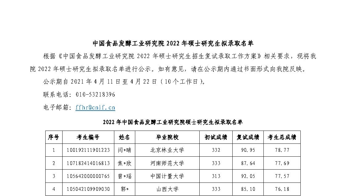 中國(guó)食品發(fā)酵工業(yè)研究院2022年碩士研究生擬錄取名單