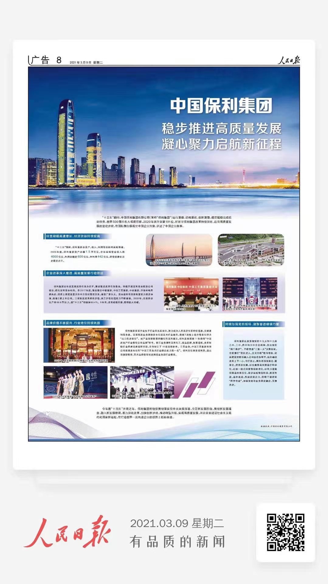 今年是“十四五”開(kāi)局之年。保利集團(tuán)將繼續(xù)貫徹落實(shí)黨中央決策部署,立足新發(fā)展階段,貫徹新發(fā)展理念,融入新發(fā)展格局,著力深化改革,加快創(chuàng)新步伐,推動(dòng)轉(zhuǎn)型升級(jí),實(shí)現(xiàn)高質(zhì)量發(fā)展,開(kāi)啟全面建設(shè)社會(huì)主義現(xiàn)代化國(guó)家新征程,在打造世界一流先進(jìn)企業(yè)的道路上砥礪奮進(jìn)。
