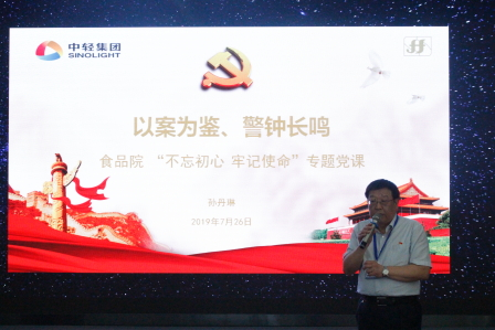 根據保利集團黨委、中輕集團黨委和食品院黨委“不忘初心,牢記使命”主題教育實施方案, 7月26日,院紀委書記孫丹琳為各部室中心副主任以上干部、在職黨員講授了《以案為鑒、警鐘長鳴》的專題黨課。